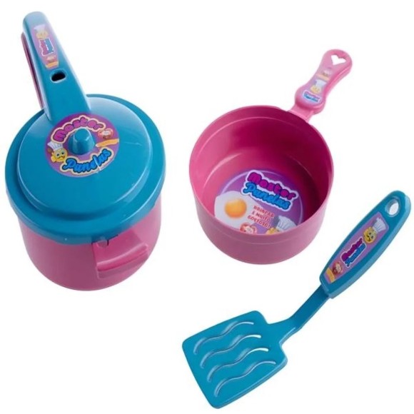 Acompanha 3 utensílios de cozinha coloridos, incluindo panela e talheres. As crianças podem brincar de faz de conta.